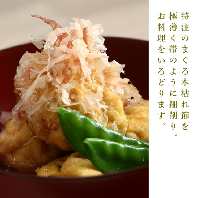 鹿児島県産のまぐろ本枯節を薄く細く帯状に削りました。かつお節と比べて魚臭くなく、タンパクで上品な風味が特徴です。お料理のトッピングに使えます。